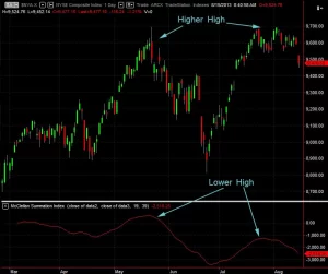 The McClellan Summation Index is not part of every stock chart package but it is available on StockCharts.com ($NYSI) and you can contact us at sales@tradingcomputers.com to request our custom code for MultiCharts and TradeStation (It is not a standard indicator on either one of those either).